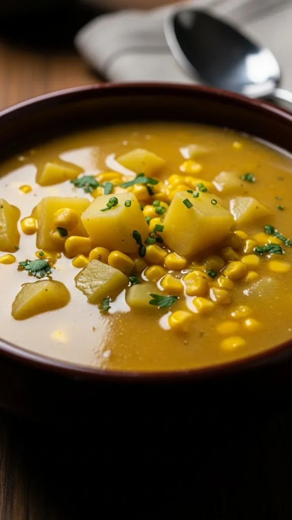 Add potatoes, corn, and broth; simmer 15 minutes.
