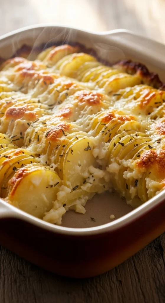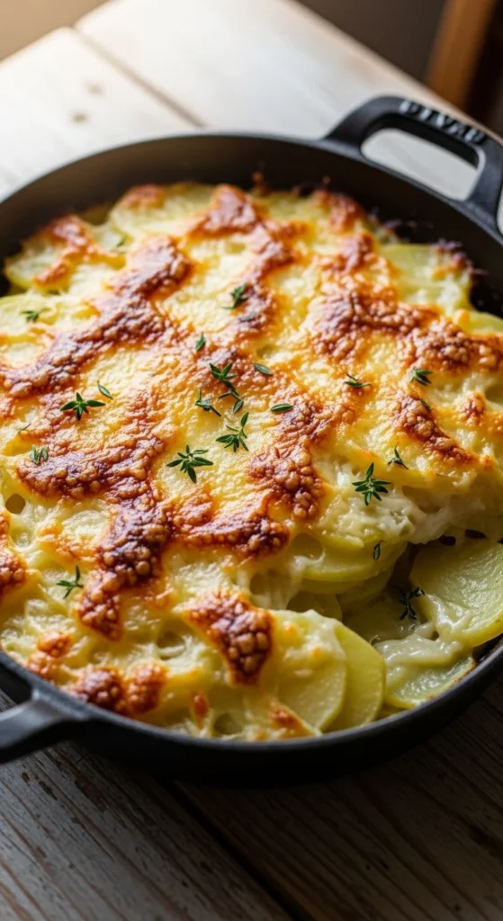 Thinly sliced potatoes bake into tender layers beneath a golden cheese top. Cream carries heat evenly, keeping the center soft while the surface browns. The texture feels comforting and familiar.