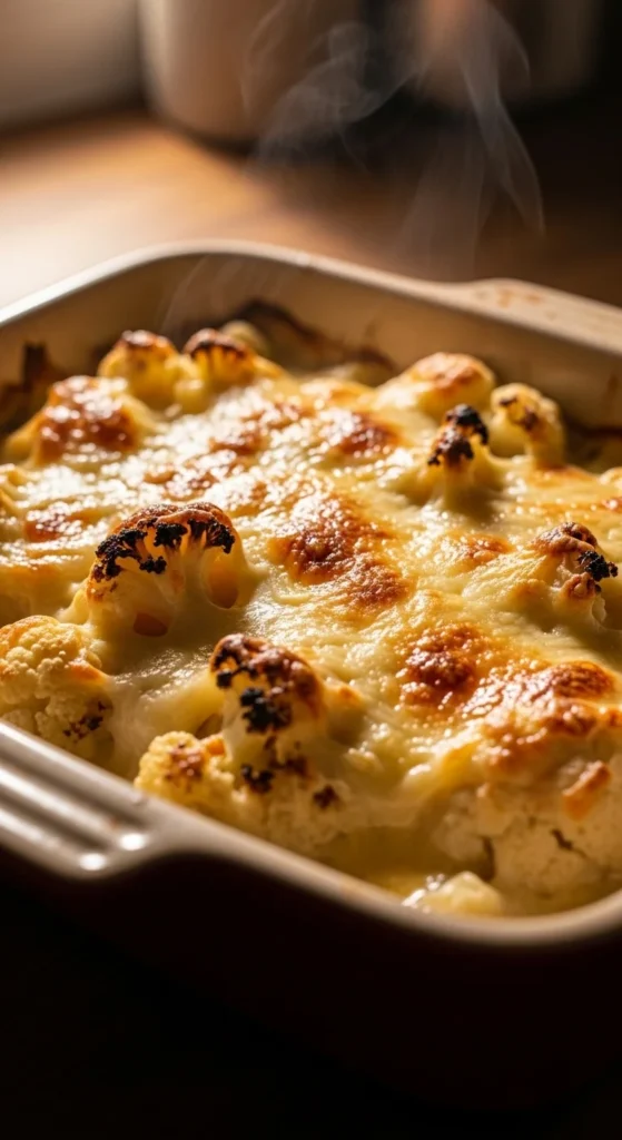 Cauliflower absorbs sauce while keeping structure. A smooth cheese sauce coats each piece, creating a creamy bite under a crisp top.