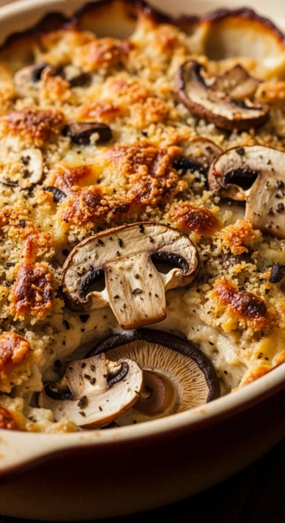 Mushrooms release savory juices as they bake, enriching the cream. A firm cheese topping keeps the surface crisp.