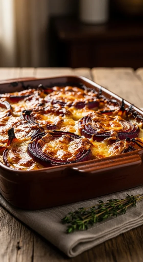 Slice onions evenly for uniform cooking. This gratin pairs well with roasted meats.