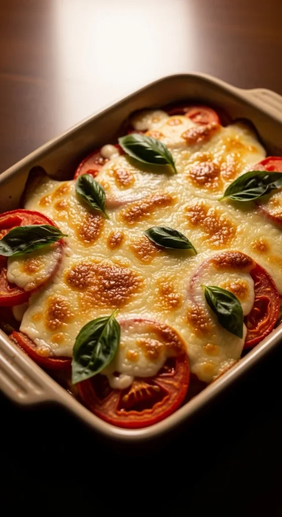 Tomatoes release juice as they bake, while mozzarella melts gently. A breadcrumb layer helps absorb moisture and keep structure.
