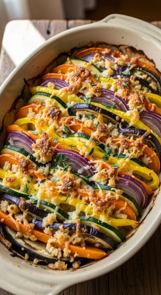A mix of vegetables bakes into varied textures under a single cheese topping. The result feels generous and adaptable.