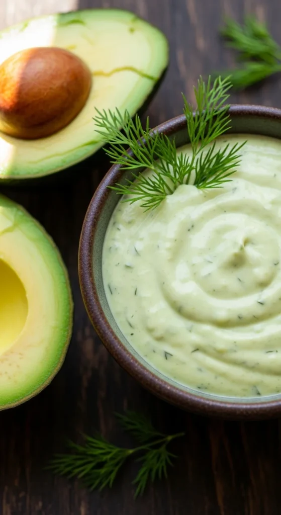 Blend ripe avocado, Greek yogurt or dairy-free yogurt, lemon juice, dill, garlic, and olive oil until smooth.