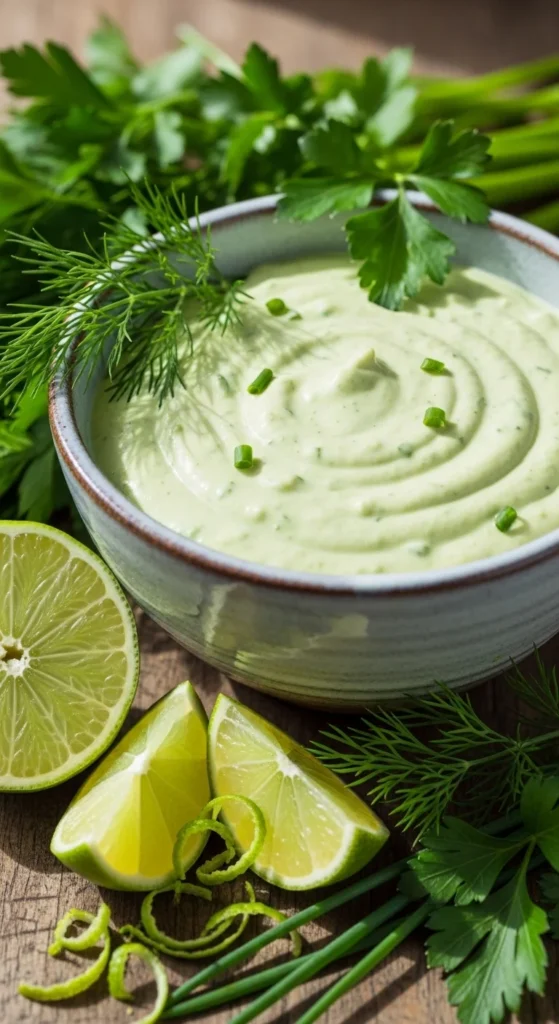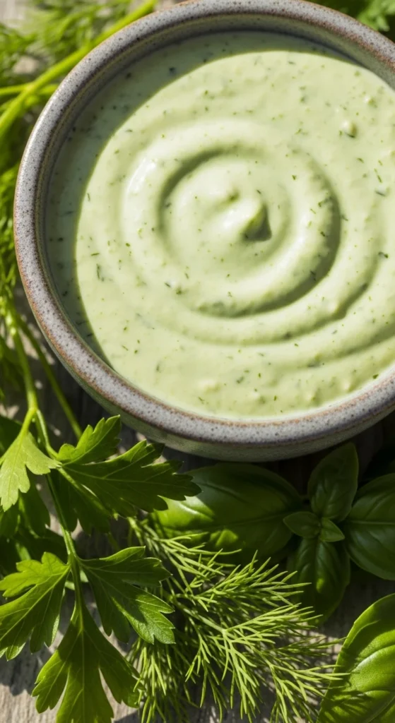 Blend ripe avocado, Greek yogurt, garlic powder, lime juice, dill, parsley, and olive oil until smooth. Add a splash of water to thin if needed.