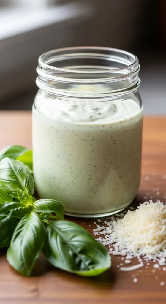 Fresh basil creates bright herbal flavor while Parmesan adds savory depth. The creamy base makes it cling well to leafy greens. It tastes fuller than bottled versions.