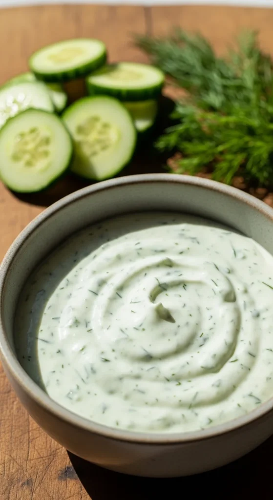 Grate cucumber and squeeze out excess water. Whisk with Greek yogurt, lemon juice, minced garlic, dill, and olive oil until smooth.