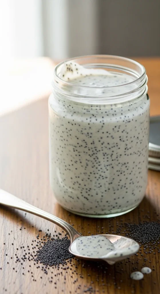 Whisk mayonnaise, Greek yogurt, apple cider vinegar, honey, and poppy seeds until fully combined. Adjust sweetness with a small drizzle of honey if needed.