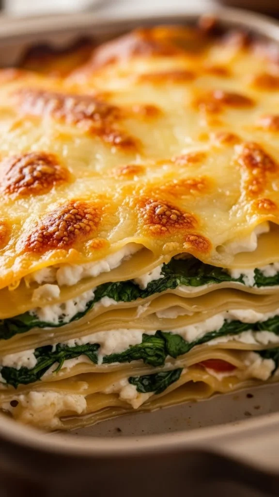 Layer sauce, sheets, spinach, ricotta, cheese.