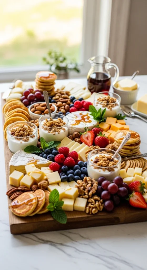 Arrange cheeses, berries, and grapes first. Add mini pancakes or waffles, small bowls of yogurt, and nuts. Include a drizzle bowl of honey or syrup.
