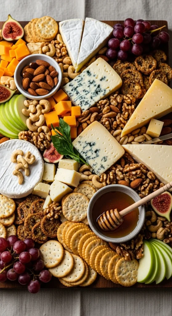 This board celebrates cheese in all textures. Soft, firm, and crumbly cheeses create variety.
