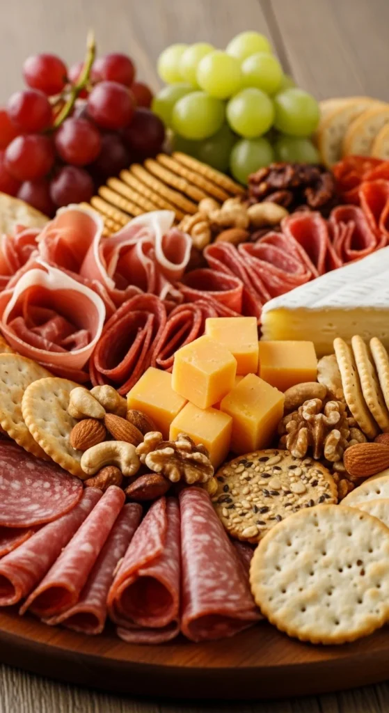 Use multiple meats and cheeses as the base. Add olives, nuts, cucumbers, and cherry tomatoes. Skip crackers or include low-carb alternatives.