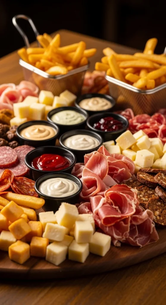 Pile hot fries in the center. Add bowls of ketchup, garlic mayo, and cheese sauce. Surround with meats and cheeses.