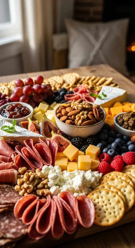 This board leans into timeless pairings that almost everyone enjoys. Soft and firm cheeses, two cured meats, fresh fruit, and crunchy crackers create balance without overthinking. It feels familiar, comforting, and welcoming for any gathering.