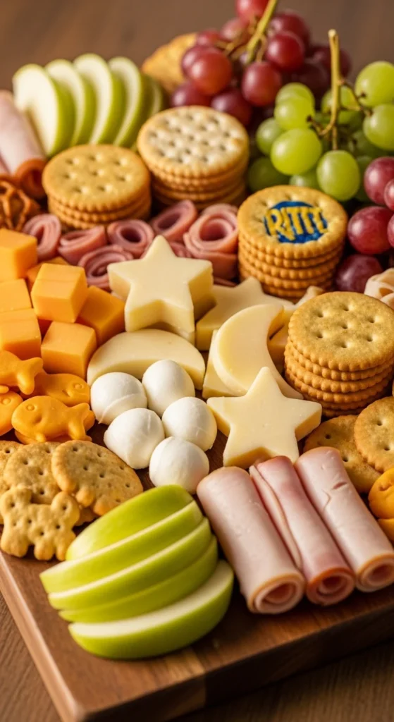 Use mild cheeses like mozzarella and colby jack. Add sliced ham or turkey, apple slices, grapes, and simple crackers. Place everything in small clusters.