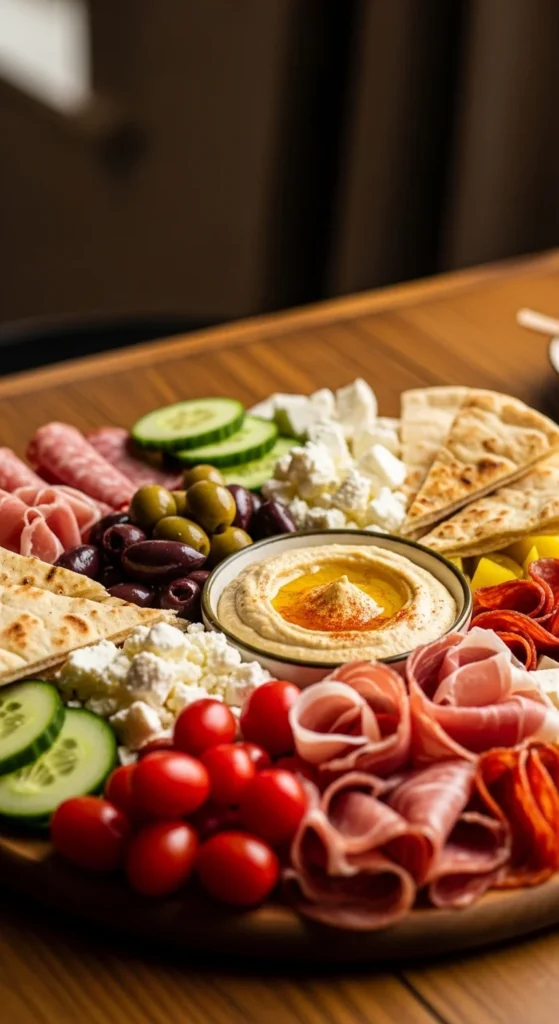 This board pulls inspiration from Mediterranean mezze platters, mixing creamy dips, salty cheeses, and fresh vegetables. The flavors feel bright and satisfying while still fitting into a classic charcuterie format.