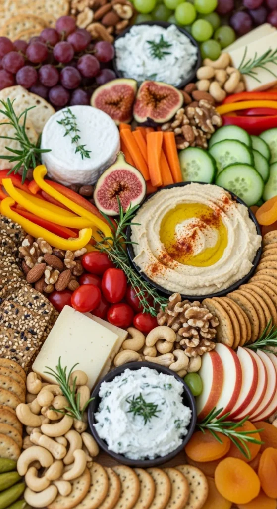 Plant-based boards are becoming more popular and can look just as abundant as traditional versions. The key is mixing creamy, crunchy, and colorful elements.