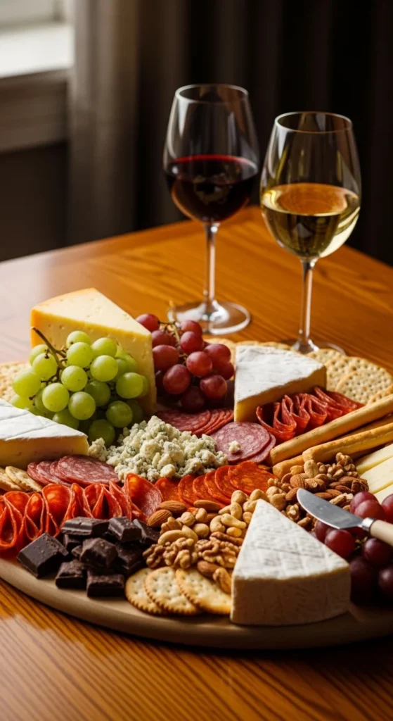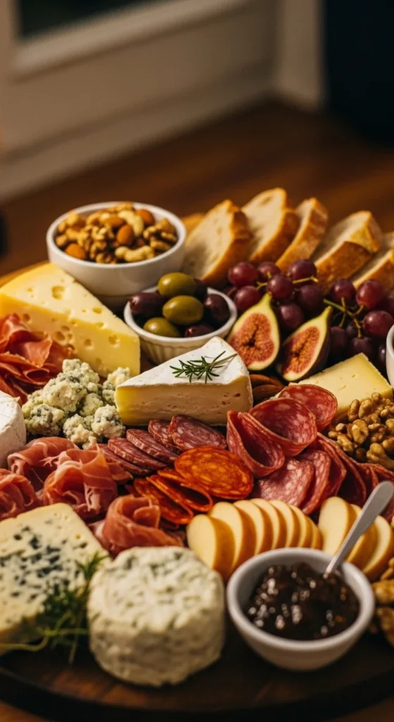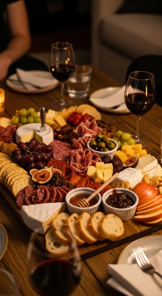 This board is built for relaxed wine nights and small gatherings. It focuses on rich cheeses, salty meats, and a touch of sweetness that pairs well with red or white wine.