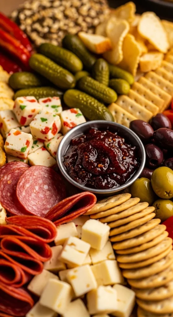 This board leans into bold flavors. Spicy meats and cheeses are balanced with pickles and a touch of sweetness.