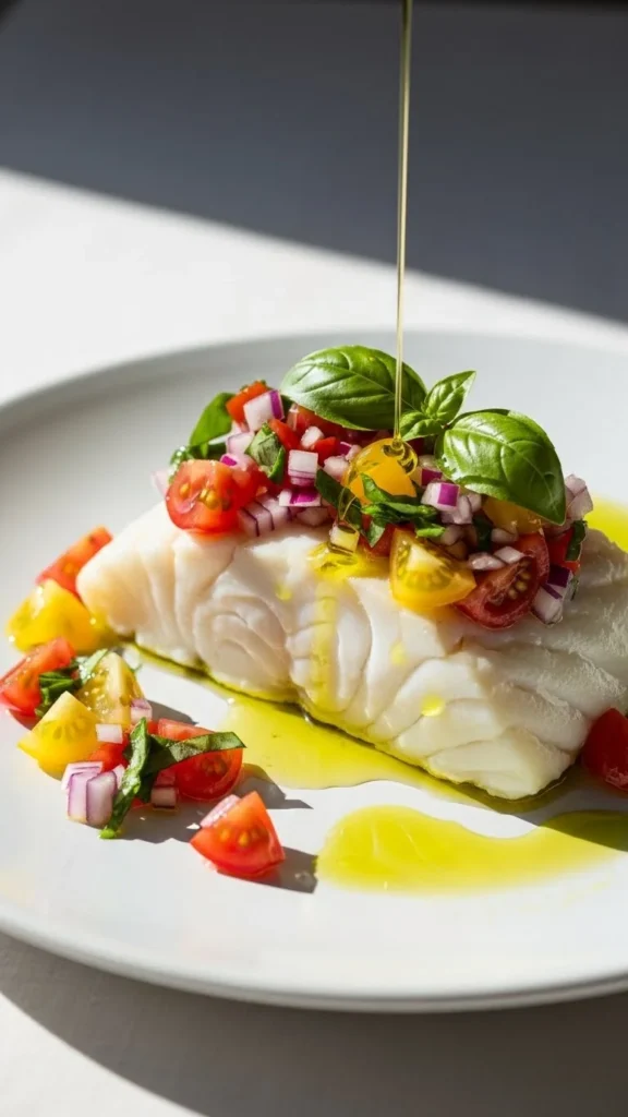 How to Serve It: Top baked cod with tomato‑basil relish, drizzle olive oil, garnish with basil leaf. Serve with steamed vegetables or rice.