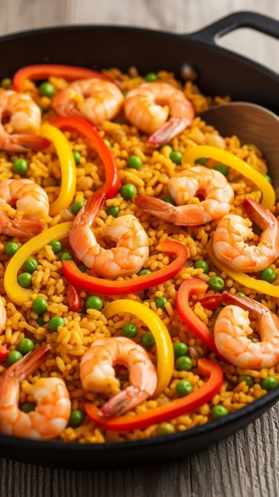 - After 10 minutes, gently press prawns into rice mixture. Scatter peas on top. Continue cooking ~8–10 minutes until rice absorbs liquid and prawns cook through (opaque pink).