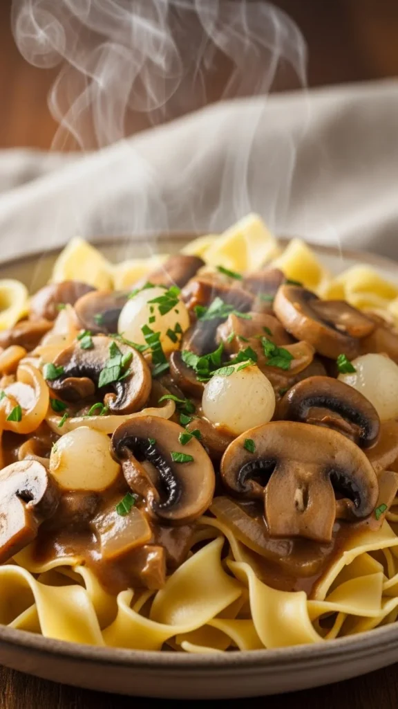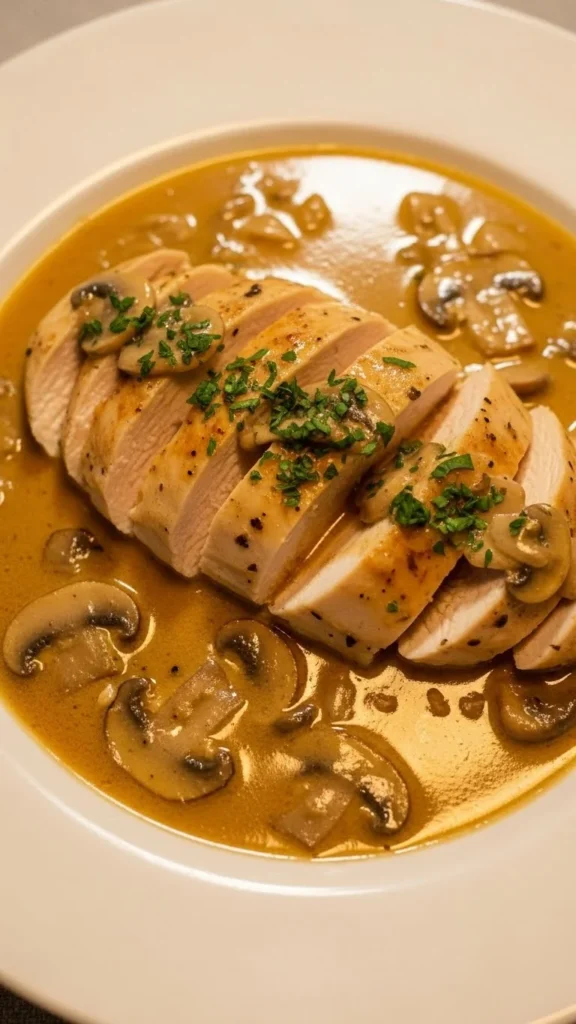 How to Serve It: Plate chicken topped with mushroom‑cream sauce, sprinkle parsley, pair with mashed potatoes or buttered noodles.