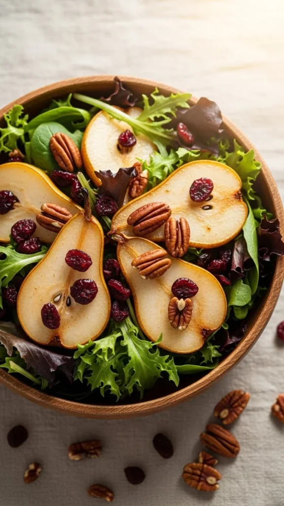 - In a large bowl, combine mixed greens, roasted pear wedges, dried cranberries, and chopped pecans.