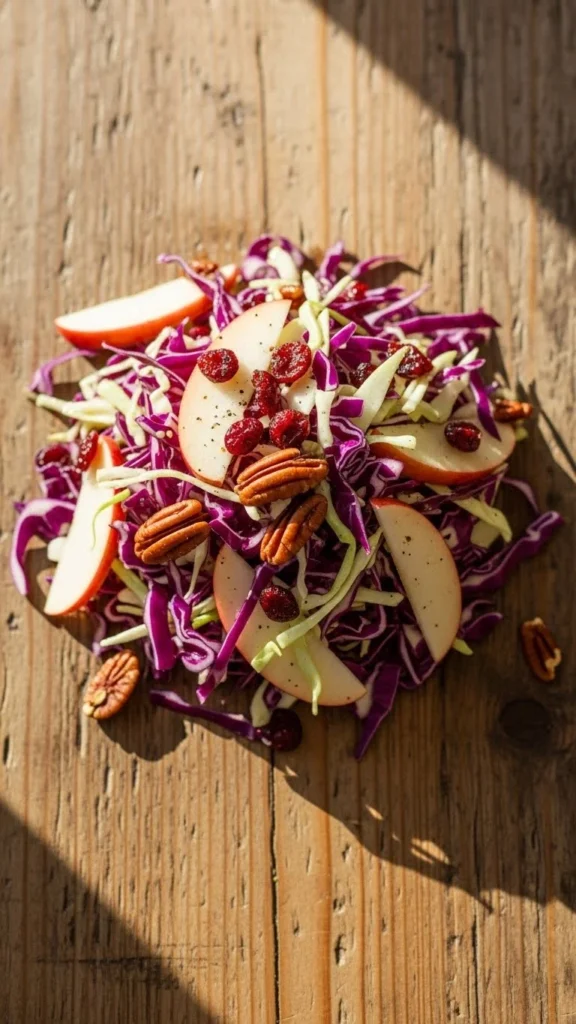 - In a large bowl, mix shredded cabbage, apple slices, dried cranberries, pecans, and chopped parsley.