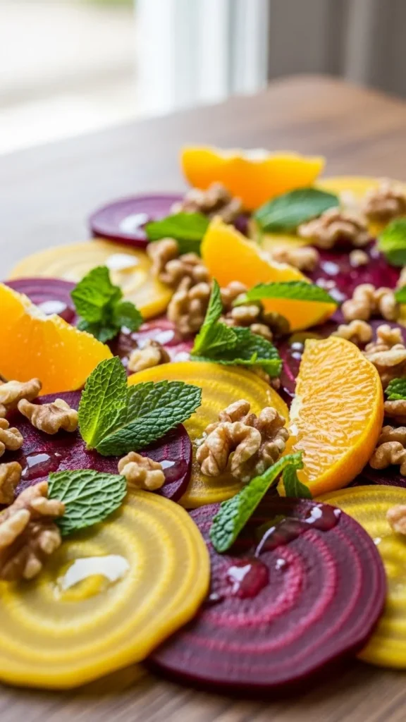 - In a large bowl, combine beet slices, orange segments, chopped walnuts, and chopped mint.