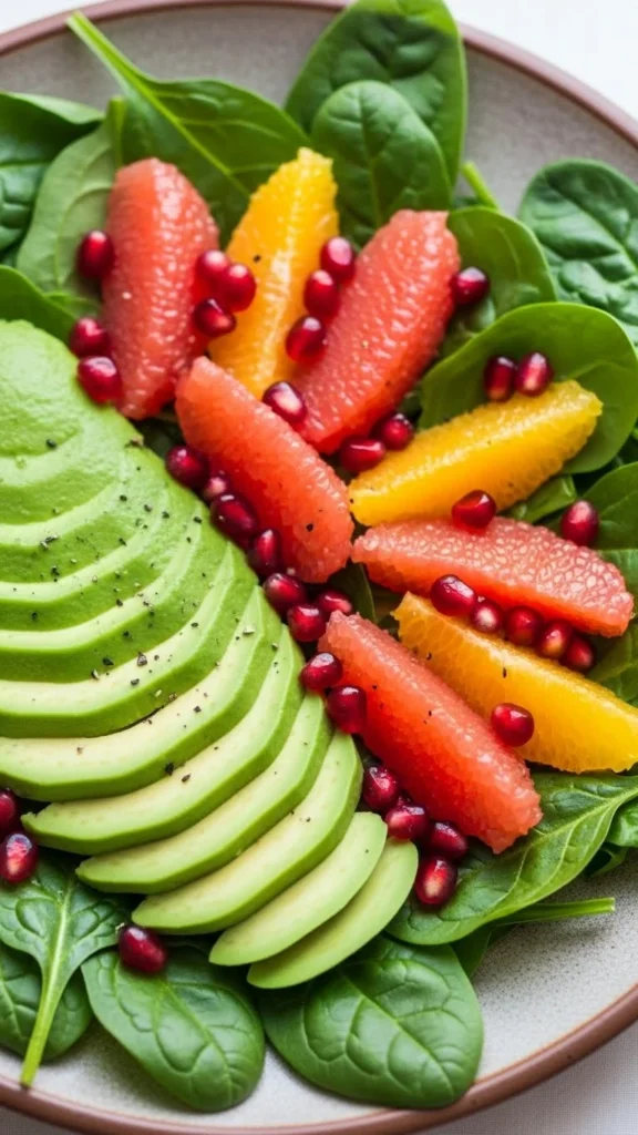 - In a large bowl, combine spinach, avocado slices, orange segments, grapefruit segments, and pomegranate seeds.