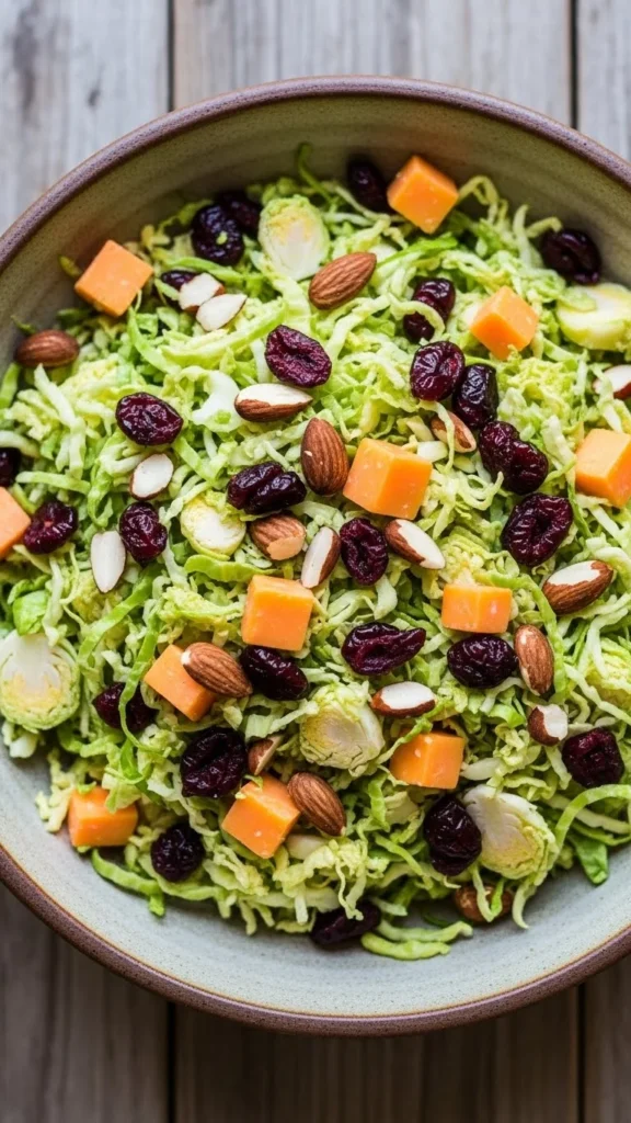 - In a large bowl, combine shredded Brussels sprouts, dried cranberries, toasted almonds, and cheddar.