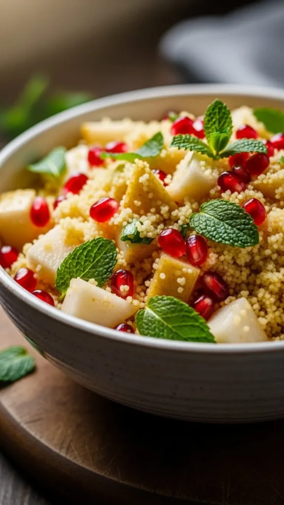 - Add diced pear, pomegranate seeds, and chopped mint to the couscous.