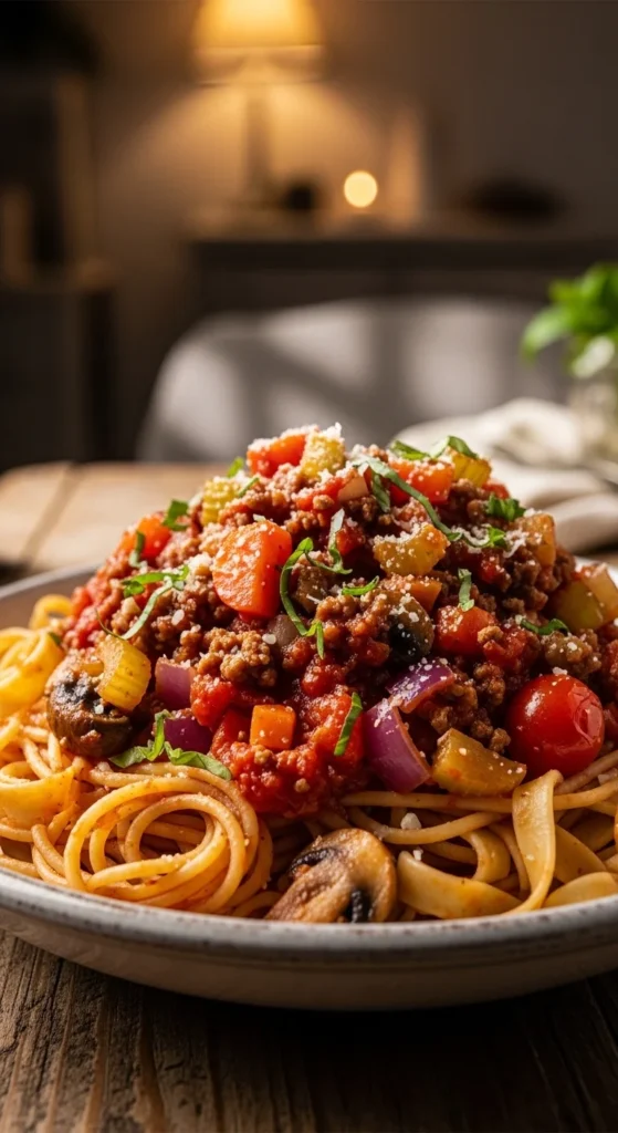 Healthy bolognese keeps the cozy feel of traditional pasta night while using lighter ingredients. The sauce is rich, thick, and deeply comforting.
