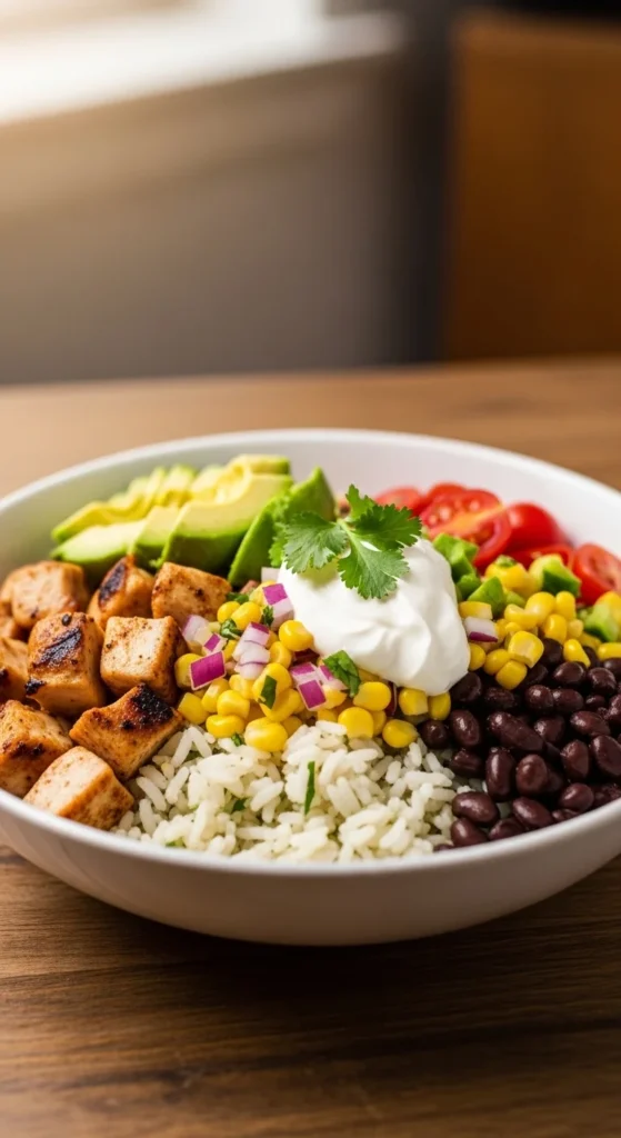 Chicken burrito bowls feel hearty and comforting while staying balanced. They bring together warm rice, seasoned chicken, and colorful vegetables in one bowl.