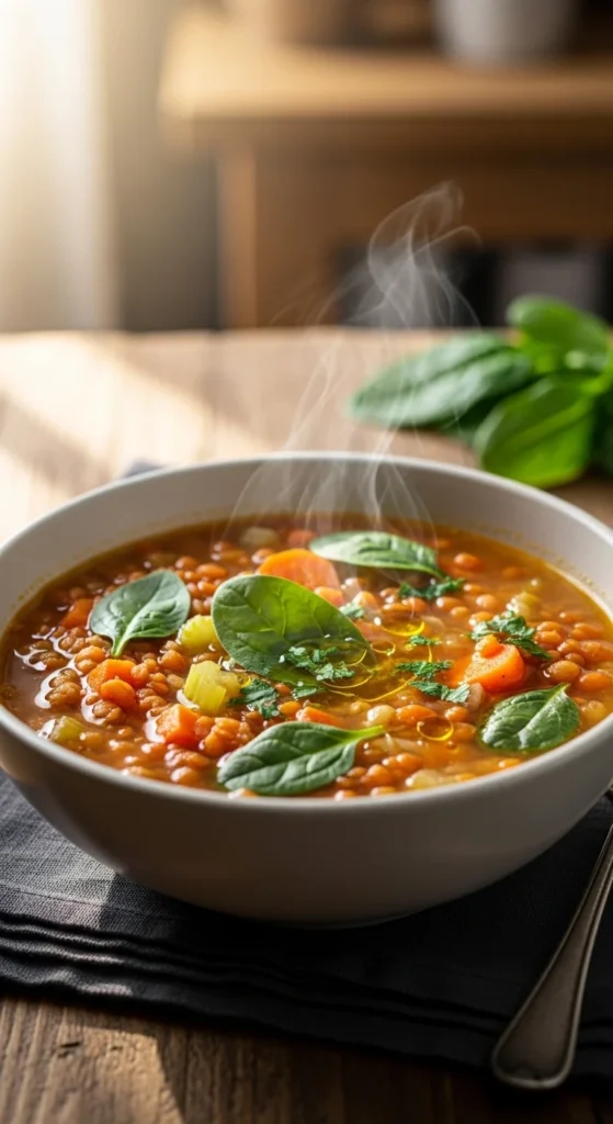 This soup offers gentle warmth and steady nourishment. Lentils soften into a thick, cozy texture while vegetables add sweetness and color.