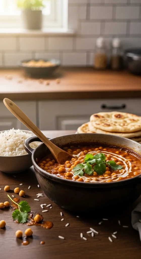 Chickpeas and coconut milk create cozy richness. Spices add warmth.