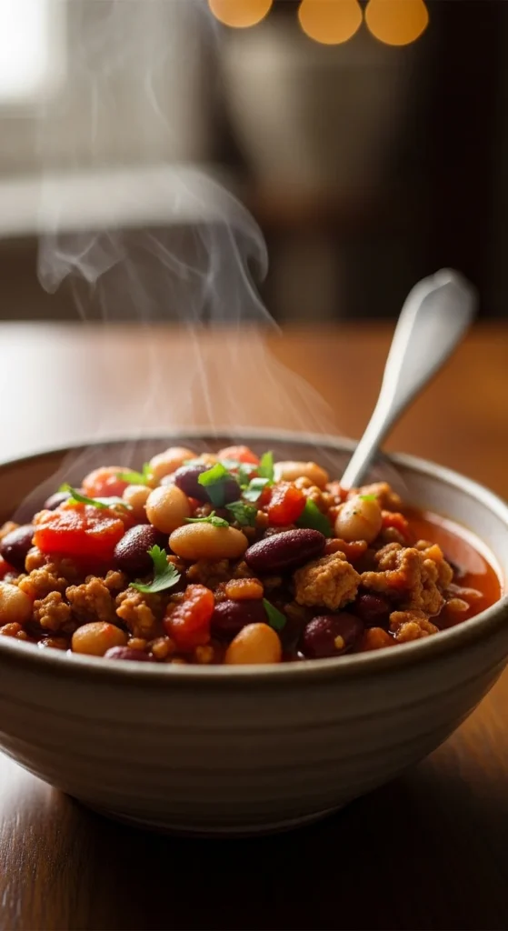 Turkey chili feels hearty and warming while staying lighter than traditional beef versions. Beans, tomatoes, and spices create depth and thickness that satisfy comfort cravings.