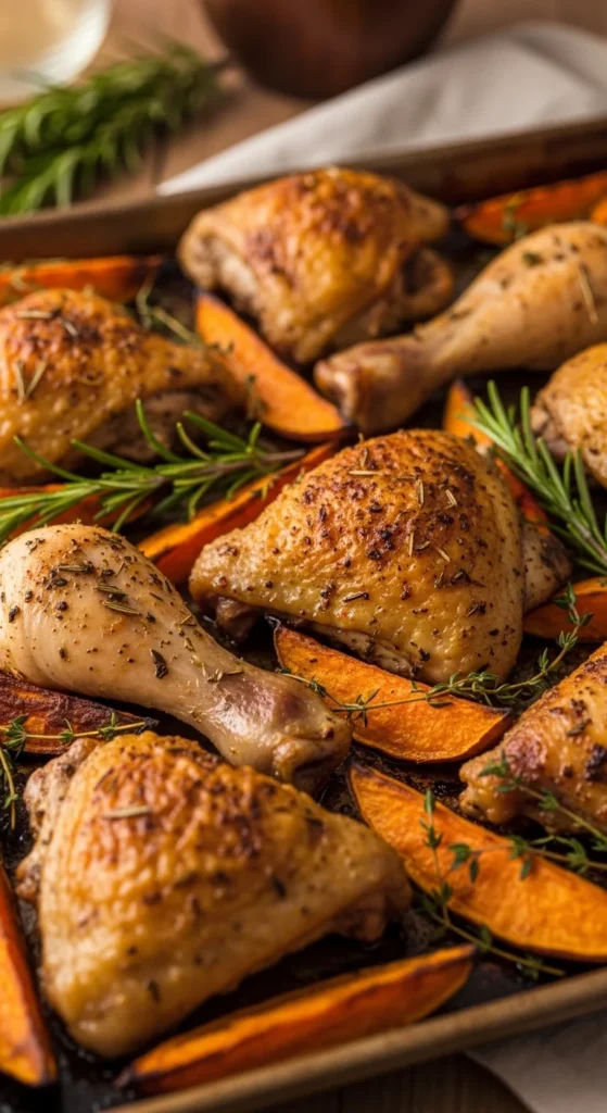 Sweet potatoes turn tender and lightly caramelized. Chicken stays juicy.