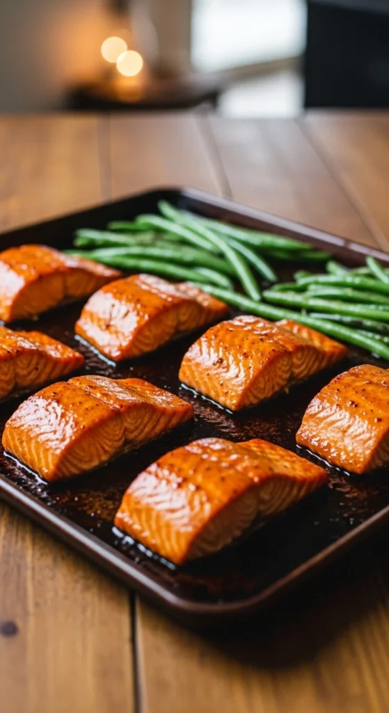 Salmon brings natural richness and comfort. Green beans roast quickly and stay crisp.