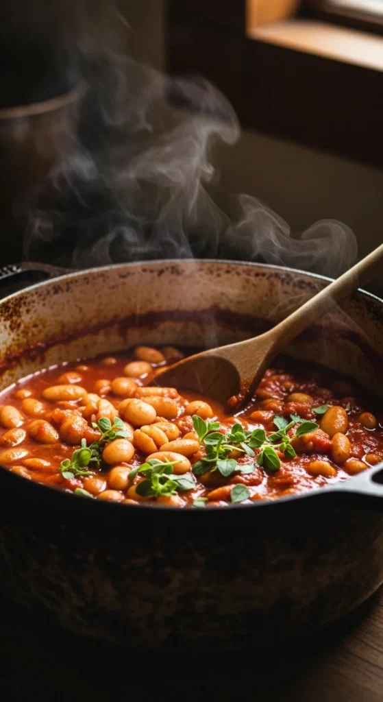 This skillet feels like a warm hug in a bowl. Beans simmered in tomato sauce become thick, rich, and deeply comforting. It’s simple, budget-friendly, and satisfying.