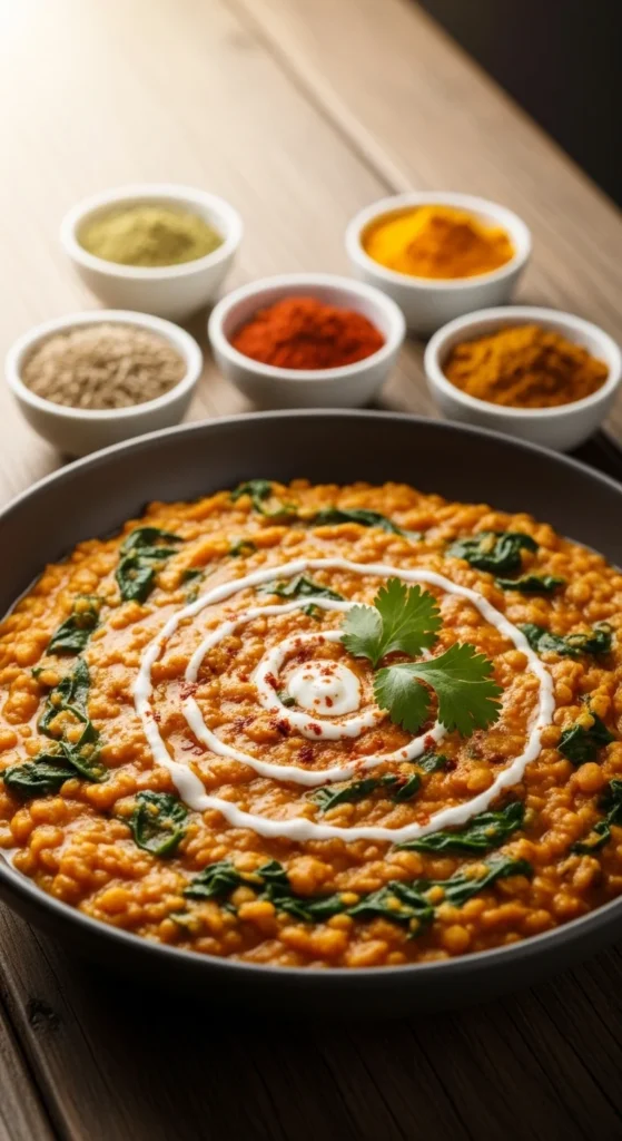Lentils simmer with onion, garlic, ginger, and curry spices. Spinach finishes it.