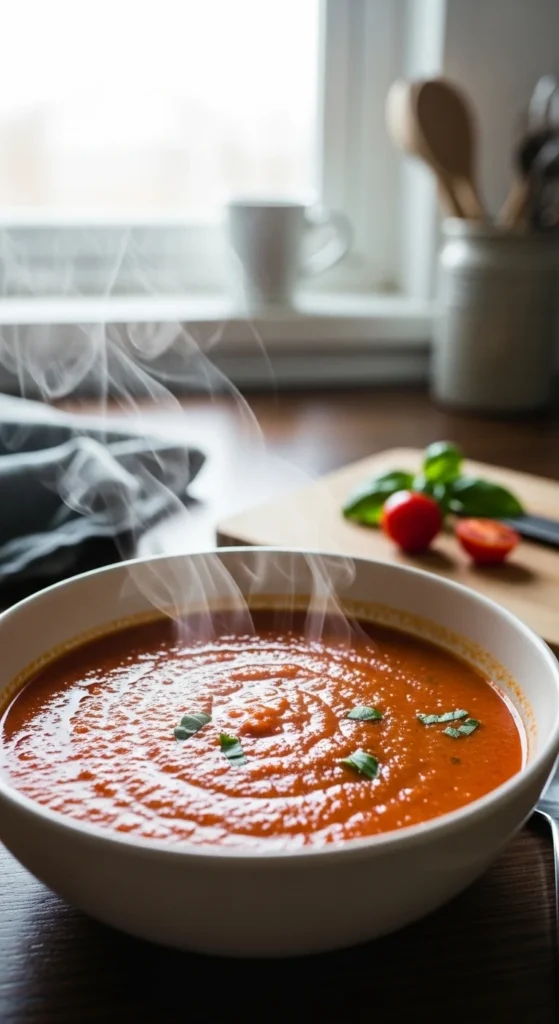Classic tomato soup becomes more filling with blended vegetables. The texture stays smooth and cozy.