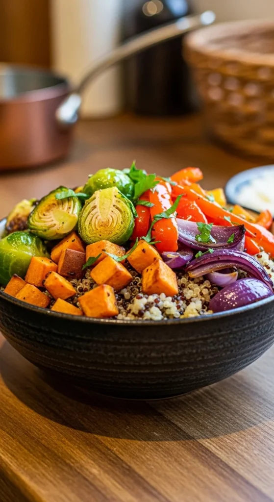Roast vegetables like sweet potatoes, broccoli, and bell peppers with olive oil and seasoning until tender. Meanwhile, cook quinoa in broth for extra flavor. Combine everything in a bowl and toss gently.