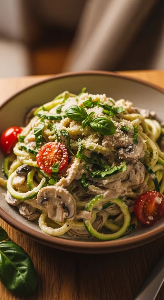 Blend cashews or hummus with garlic, broth, and a small splash of milk until smooth. Warm the sauce gently in a pan, then add zucchini noodles and toss just until tender. Overcooking will make them watery, so a quick toss is enough.