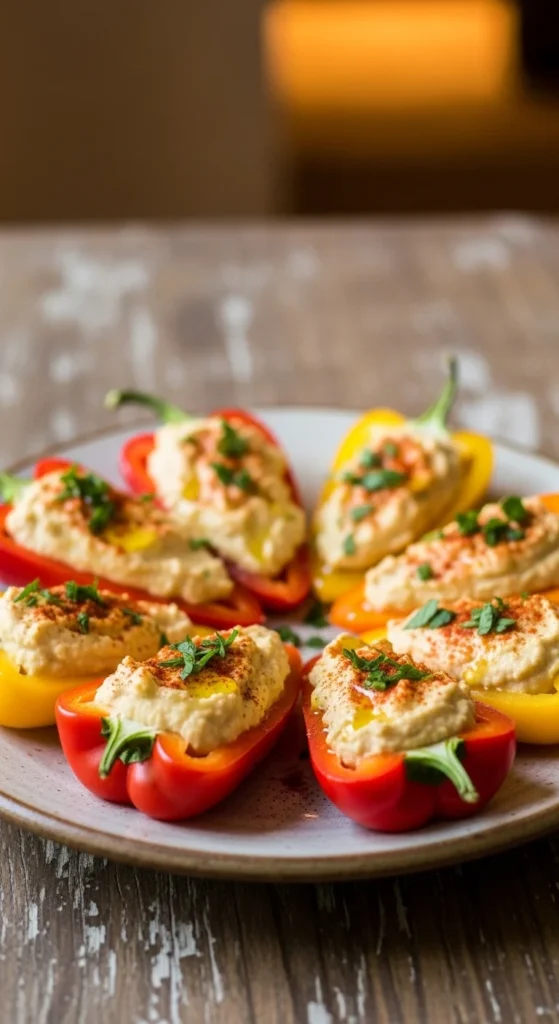 Hummus-stuffed mini peppers offer a perfect mix of creamy and crunchy in every bite. The natural sweetness of the peppers balances the savory hummus, making this snack feel fresh and filling.