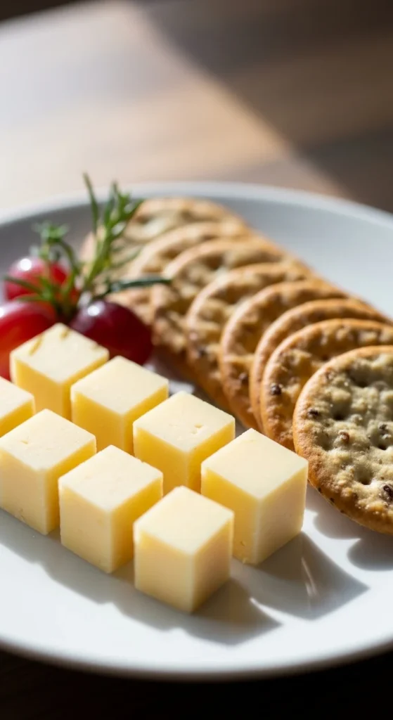 Cut cheese into cubes or thin slices. Pair with whole-grain crackers. Keep portions balanced.