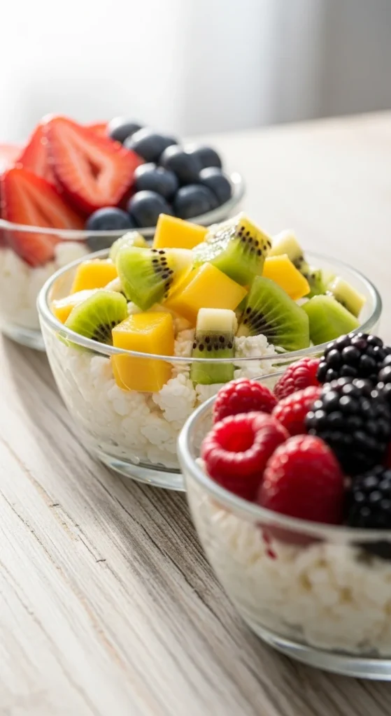 Spoon cottage cheese into small bowls. Add diced peaches, pineapple, or berries on top. Stir lightly or keep layers separate.