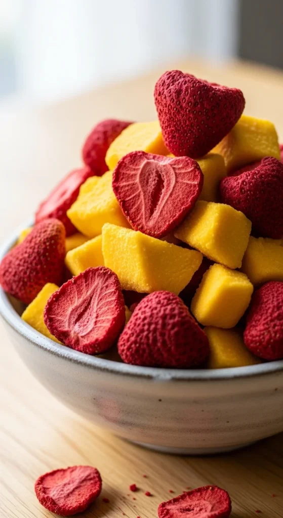 Freeze-dried fruit feels crunchy like chips but contains only fruit. The intense flavor often surprises kids in a good way.