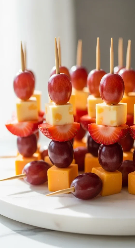 Thread grapes, strawberries, and cheese cubes onto short skewers.