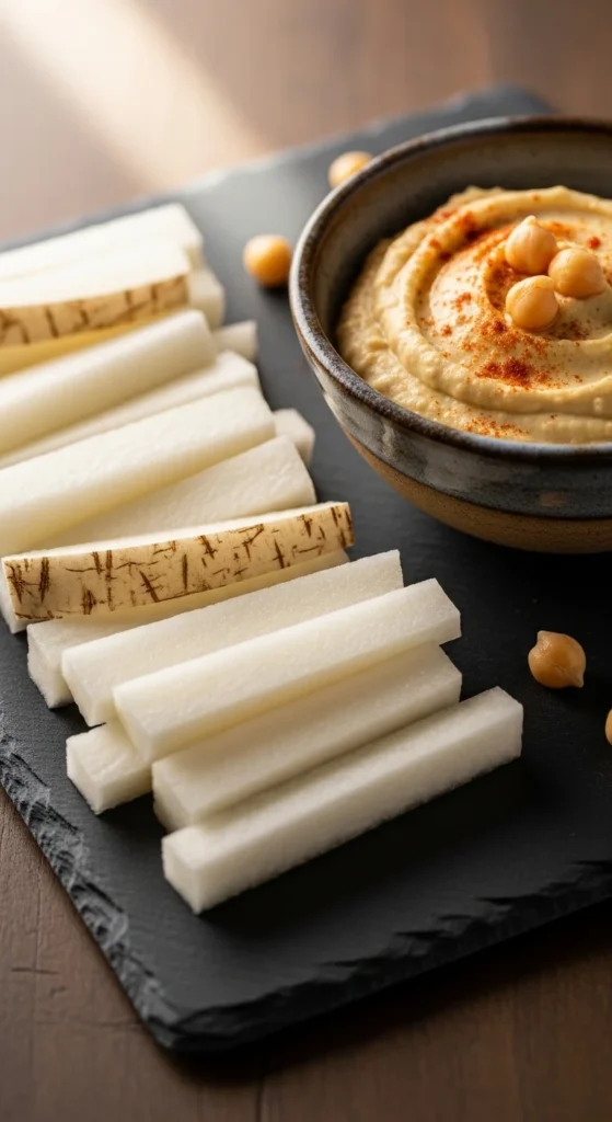 Jicama has a mild crunch similar to apples and potatoes. It works well for kids who like crispy snacks. Pairing with dip makes vegetables feel more fun.
